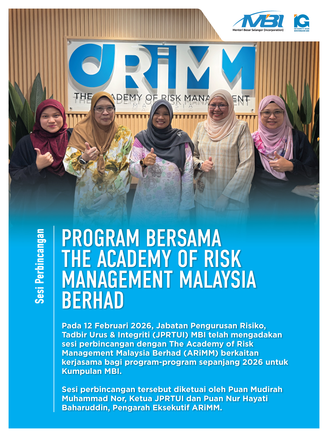 Pada 12 Februari 2026, Jabatan Pengurusan Risiko, Tadbir Urus & Integriti (JPRTUI) MBI telah mengadakan sesi perbincangan dengan The Academy of Risk Management Malaysia Berhad (ARiMM) berkaitan kerjasama bagi program-program sepanjang 2026 untuk Kumpulan MBI. Sesi perbincangan tersebut diketuai oleh Puan Mudirah Muhammad Nor, Ketua JPRTUI dan Puan Nur Hayati Baharuddin, Pengarah Eksekutif ARiMM.
